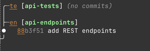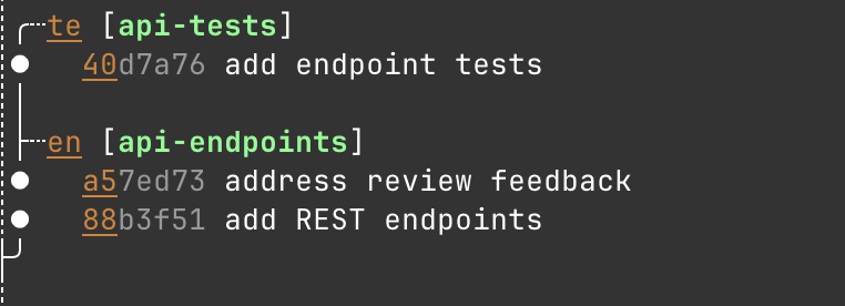 So let's say I'm working on the api-endpoints branch and get some good feedback on my PR. It's easy to resolve the comments there while leaving my api-tests branched off this api-endpoints as a stacked thing that understands the relationship back to the first branch as shown here.