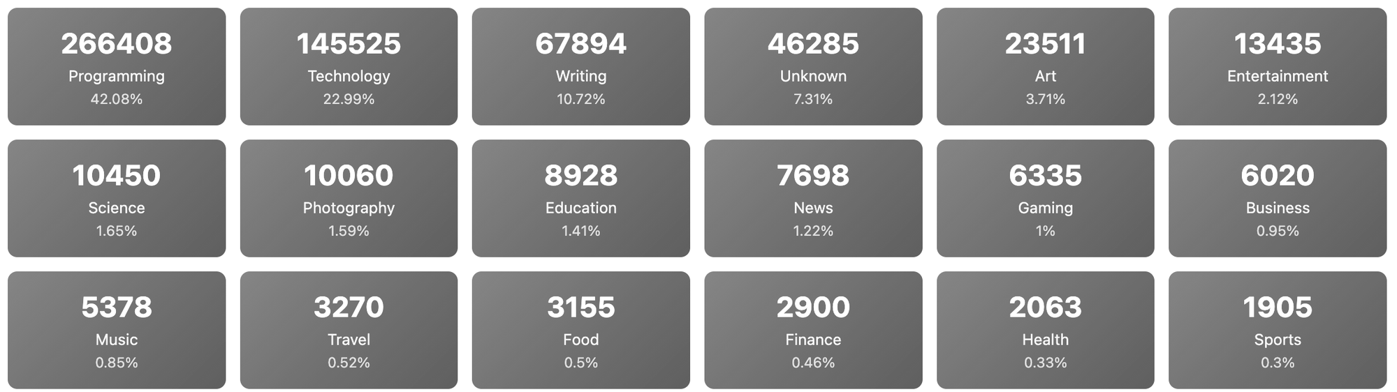 One of the most common requests I've gotten from users of my little Firefox extension(https://timewasterpro.xyz) has been more options around the categories of websites that you get returned. This required me to go through and parse the website information to attempt to put them into different categories. I tried a bunch of different approaches but ended up basically looking at the websites themselves seeing if there was anything that looked like a tag or a hint on each site.