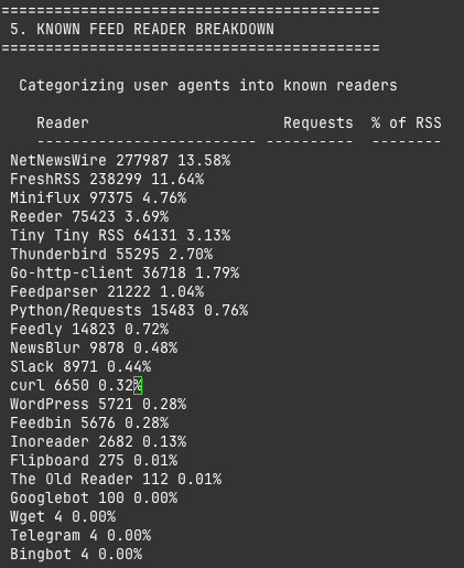 The user-agent breakdown shows the usual suspects — the RSS readers you'd expect, the ones that have been around long enough to have their own Wikipedia articles. There are also some abusers in the metrics. I have no idea what "Daily-AI-Morning" is, but whatever it's doing, it's polling my feed with the frantic energy of someone refreshing a package tracking page on delivery day.